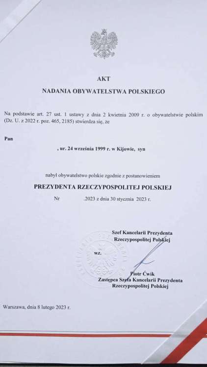 Вітаю всіх, Вирішила поділитись гарною новиною. Перевірила дані PESEL і побачила зміну в графі громадянство на POLSKIE. Потім зайшла на https://inpol.mazowieckie.pl на мій акаун і побачила на Oś czasu "OOiR - rejestracja postanowienia o nadaniu obywatelstwa polskiego 21.02.2024 зміна 13.03.2024" Ще лістів від уженду не отримувала. Мій бекграунд. Польского коріння нема. Переїхала у Польшу у 2015 на навчання, і з того моменту мала 3 карти побиту і в січні 2022 отримала Резидента. Документи збирала сама, і заповнювала сама.Додавала, все що могла. Мала декількак довгих проєктів з волонтерством, участь у студеньскій організаціі під час навчання, і читала лекціі для них вже після випуску. Підтвердження участі у виставках, диплом магістра та післядипломної освіти та референціі з роботи + написала автобіографію. Все звісно було завірено нотаріально. Подавалась у Варшаві Відправила всі документи листом 05.10.2022 10.10.2022 в профілі Inpol зʼявилась інформація що лист дійшов Пізніше я зорієнтувалась що не додала автобіографію, дописала її у грудні і відправила на початку тогож місяца. 14.12.2022 в профілі Inpol зʼявилась інформація що лист з автобіографією дійшов і в полі Оновлення дата змінилась на 14.12.2022 06.06.2023 в в профілі MSWiA в полі Оновлення змінилась дата на 06.06.2023 відправили мої документи кудись ( МВС) 23.06.2023 отримала лист з МВС що моє прохання разом з опінієм отримали Лист з МВС що вислали до канцеляріі мені здається не отримувала. Десь пару місяців назад подумувала писати прохання закрити мою справу, тому що набридло чекати, і шанси невеликі + переїхала в іншу європейську країну тому що вийшла заміж, і є перспектива отримання іншого громадянства через 3 роки. Але звісно Польща, стала другим домом, тому вирішила почекати аж поки прийде відмова XD І ось, такий сюрприз. Тобто від подачі 05.10.2022 до реєстраціі рішення 13.03.2024 пройшло пройшло 1.5 року. Тепер чекаю на лист. Всім удачі, і гарних новин.14 баллов
