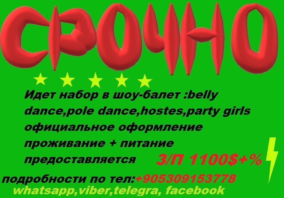 ПРИГЛАШАЕМ НА РАБОТУ : -ТАНЦОВЩИЦ( BELLY DANCE ,POLE DANCE ,SHOW-BALET, GO-GO ) -HOSTES -VOKAL -PARTY GIRLS -ТУРЦИЯ -ОПЛАТА 1100$ -ПРОЖИВАНИЕ -ПИТАНИЕ -ПОДРОБНОСТИ ПО ТЕЛ +905309153778 whatsapp,viber,telegram Alisa