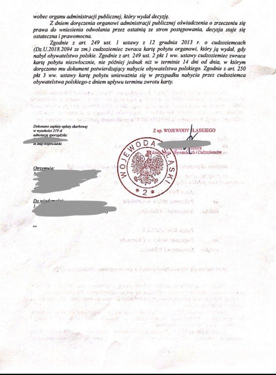 На каком основании? Что в законе об этом написано? В день подписания децизии мне позвонила пани и сказала что я могу приехать и забрать ее. Я сразу проверил данные PESEL и там уже было написано обывательство польское