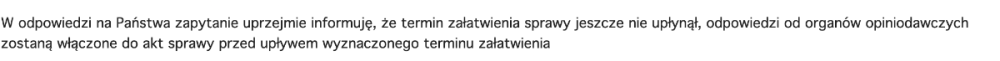 14. Я сегодня тоже получил ответ на вопрос, заданный через formularz kontaktowy. Если в прошлый раз, когда я их спросил, отправили ли они все запросы и получили на них ответы, они ответили, что "все было выслано согласно закону, однако получили ли мы все ответы - сказать не можем, поскольку акты справы еще не заполнены." Параллельно, я подал запрос на просмотр своего дела (23 октября). Дата децизии в инполе - середина декабря. Отвечая на их имейл, я в следующем письме указал, что подался 6 июня, и уже прошло 5 месяцев, и что донёс все документы, которые они требовали в везвание от 30 июля. Так же указал, что не понимаю, почему они не могут мне сказать, получили ли все они ответы от служб уже сейчас, сказал, что уженд не освобождается от ответственности залатвич мою справу вовремя, не смотря на большой поток дел, и напомнил, что имею право на ponaglenie. В итоге, сегодня получаю такой ответ. Они специально отвечают так? И как понять, что термин еще не закончился? Согласно закону - это разве не 2 месяца (и пофиг какая дата децизии в иноле)? Я думал, что если уже и писать ponaglenie, то после просмотра дела - но на никаких приглашений от них я не получил. Стоит ли им уже выслать понагление? Меня бесит, что никаких апдейтов по делу нет, а я им всегда высылаю свежие ЗУСы и постоянно спрашиваю, что нужно ли еще донести.