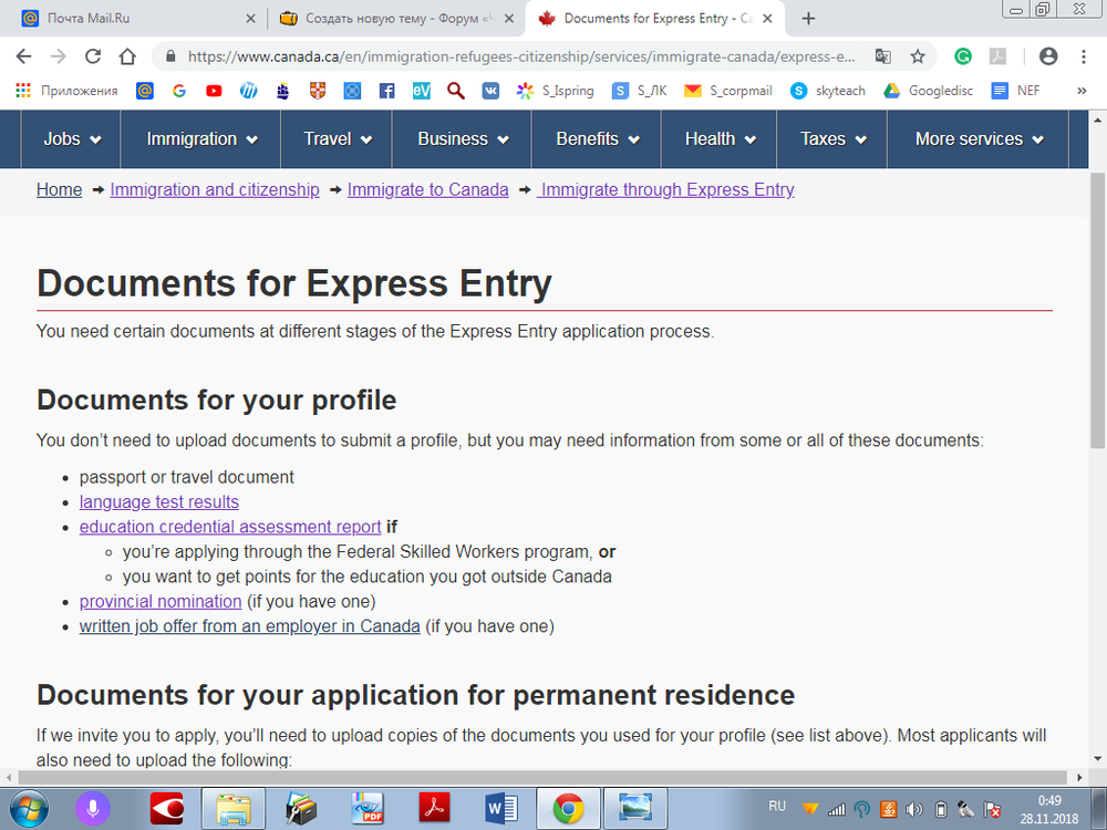 Jannur Опубликовано 27 ноября, 2018 Жалоба Опубликовано 27 ноября, 2018 Где найти полный список документов для подачи по EE? На официальном сайте https://www.canada.ca/en/immigration-refugees-citizenship/services/immigrate-canada/express-entry/documents.html я не нашла. Там только паспорт, результаты ielts, эвалюация диплома, номинация от провинции и джобоффер если есть. А как же все остальные документы такие как свидетельство о браке, рекомендательное письмо и т.д? Я так понимаю что для подачи на EE достаточно первых документов, но если ты проходишь надо же собирать остальные? Почему-то на сайте я не нашла! Помогите пожалуйста! Цитата
